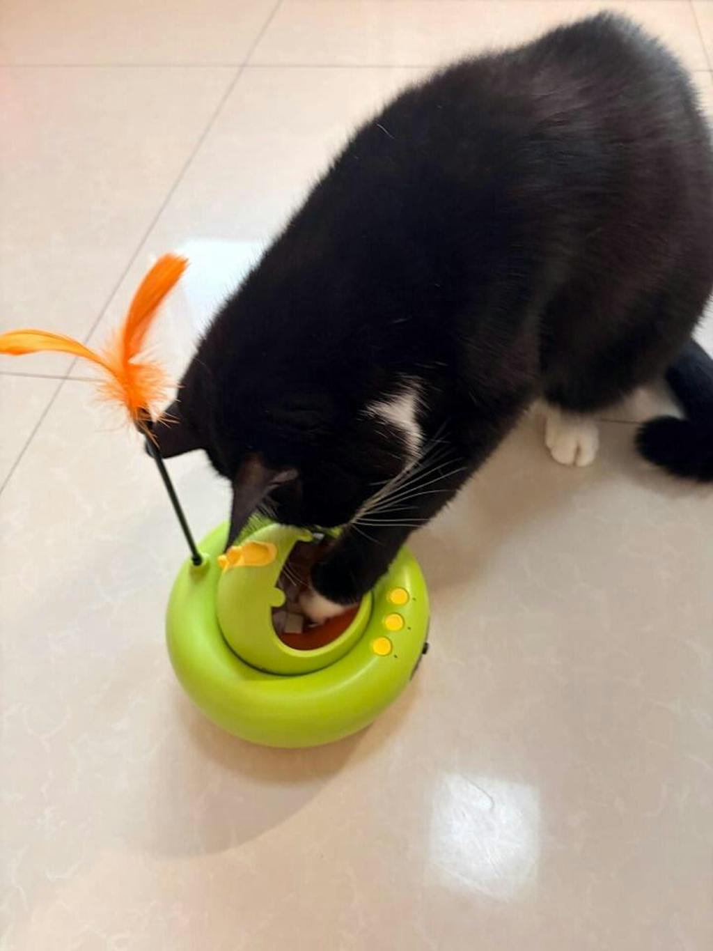 • Interactive treat-dispensing cat toy with removable wheels for easy hair cleaning and maintenance